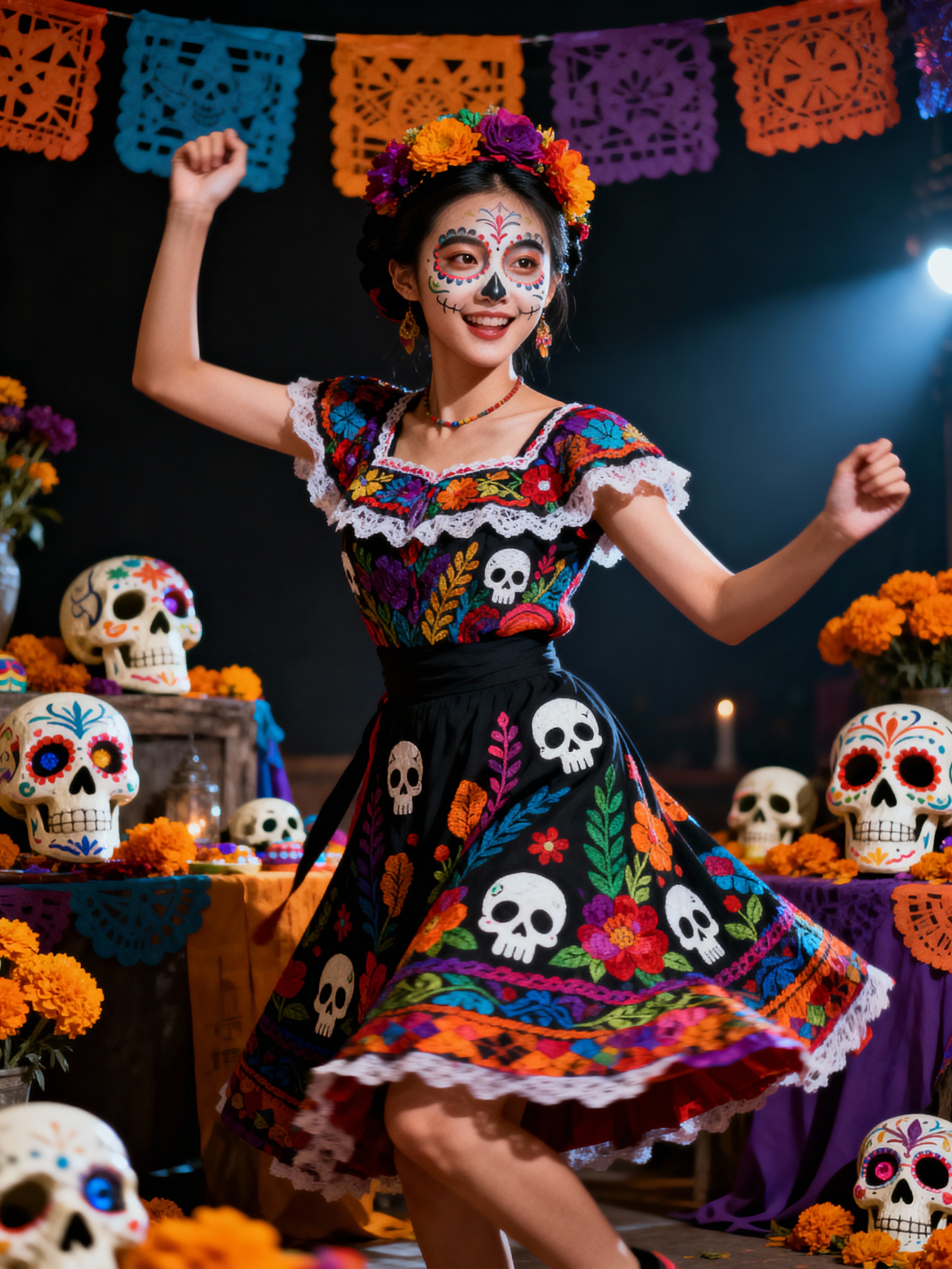 a model in a colorful traditional dress with skull motifs , capturing their joyful energy during the celebrations, with sugar skulls and marigold decorations