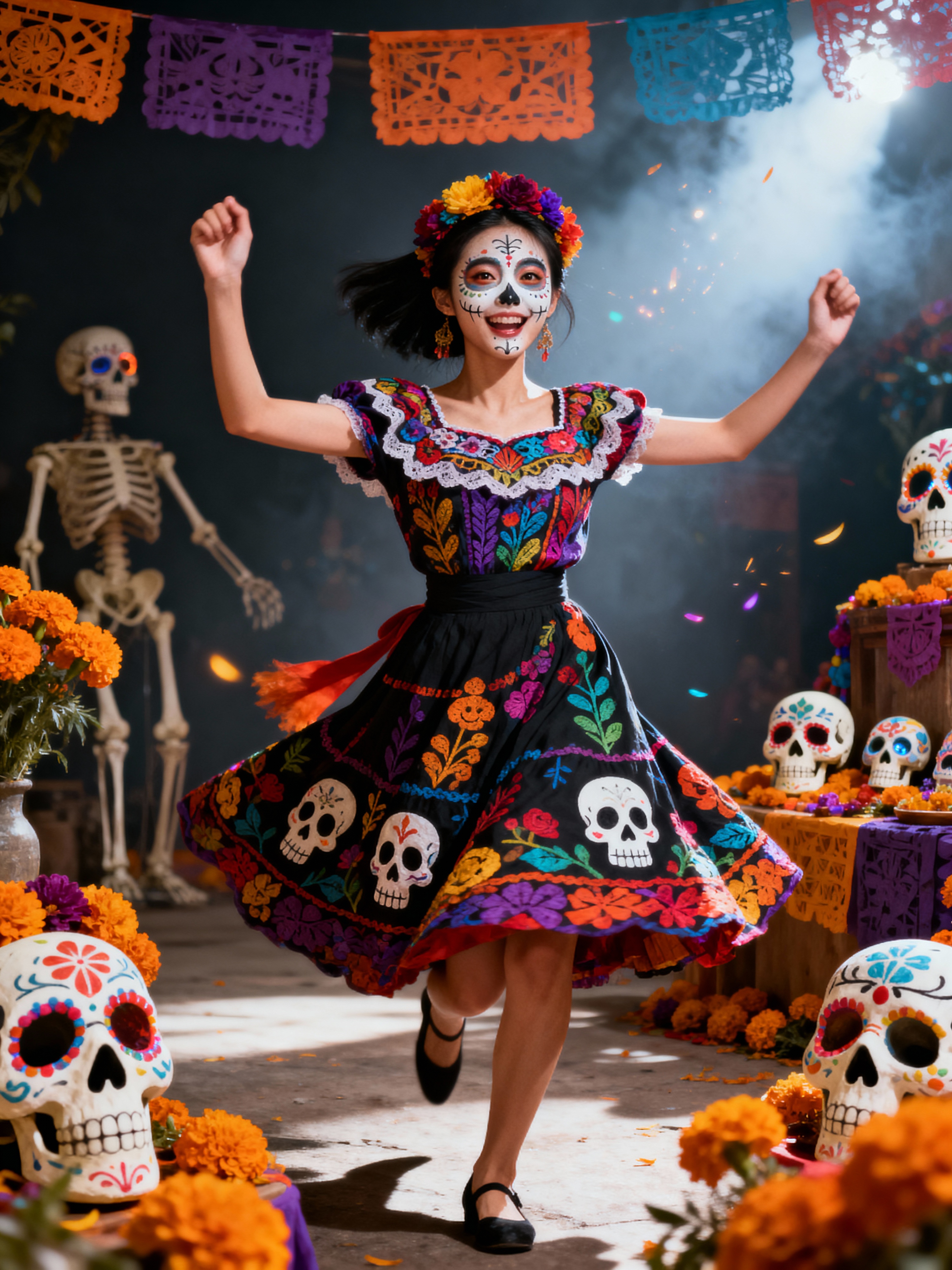 a model in a colorful traditional dress with skull motifs , capturing their joyful energy during the celebrations, with sugar skulls and marigold decorations