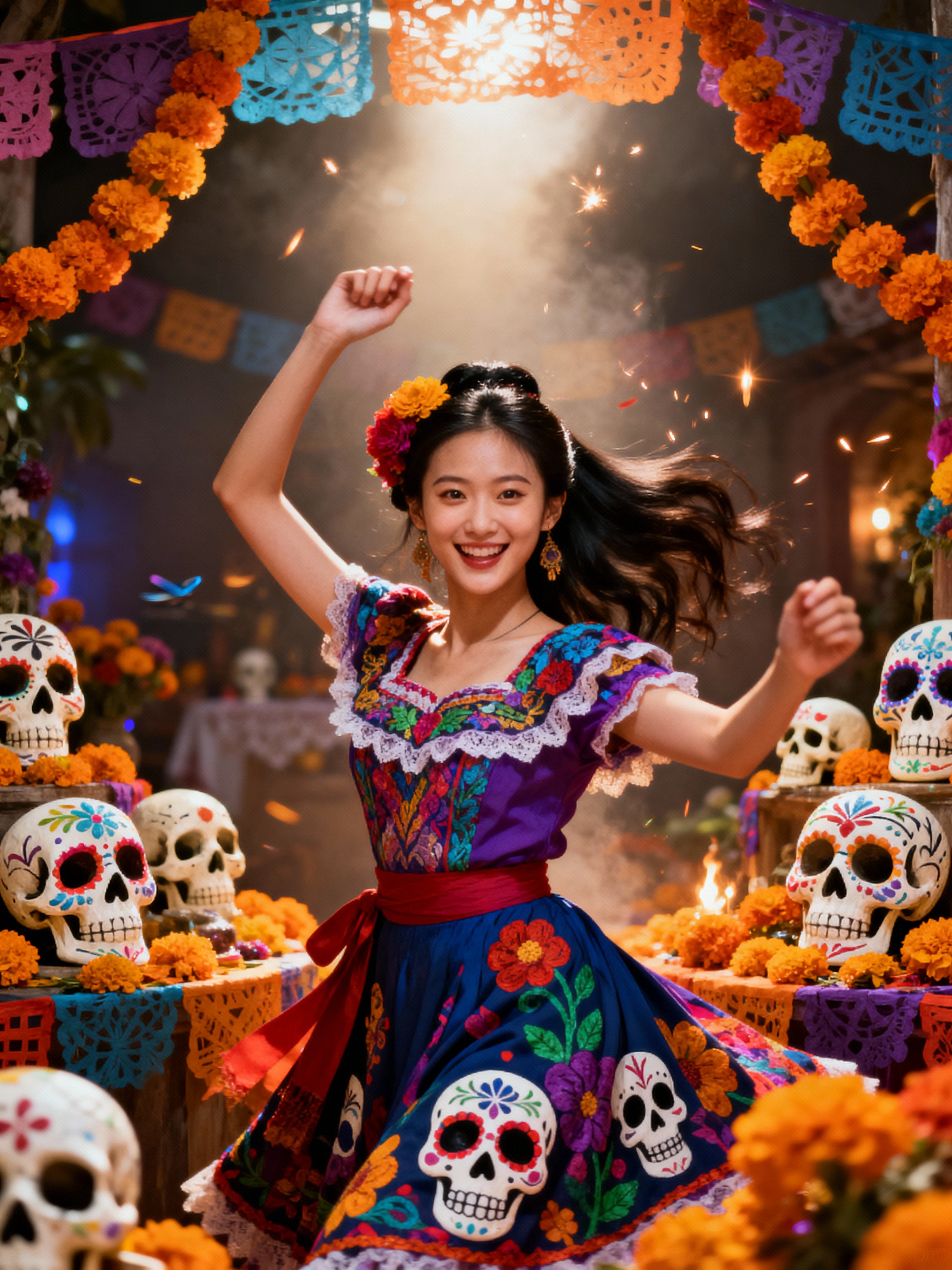 a model in a colorful traditional dress with skull motifs , capturing their joyful energy during the celebrations, with sugar skulls and marigold decorations