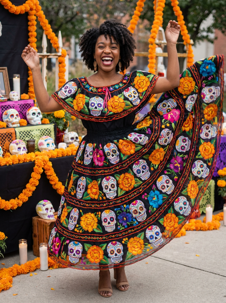 a model in a colorful traditional dress with skull motifs , capturing their joyful energy during the celebrations, with sugar skulls and marigold decorations