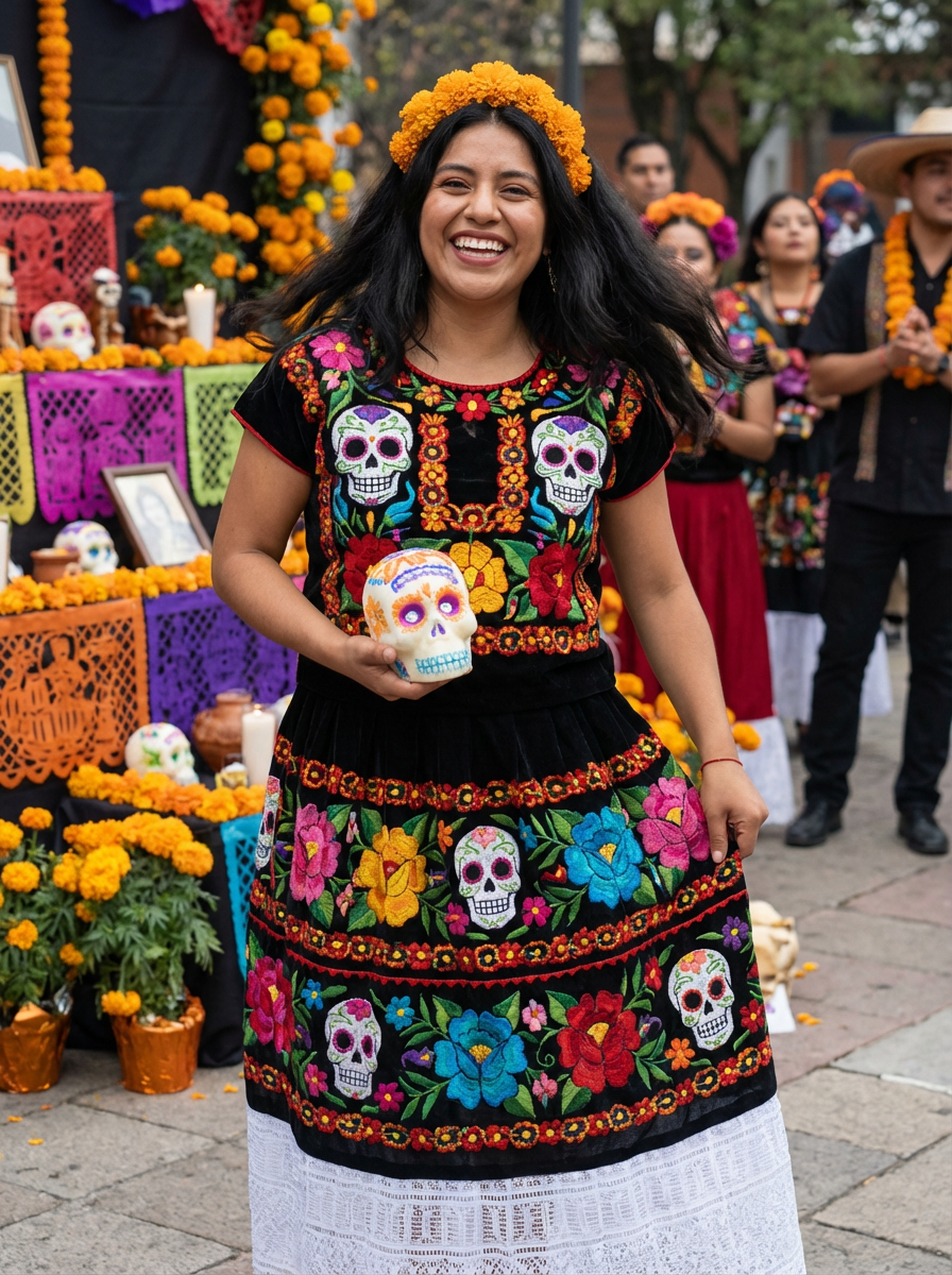 a model in a colorful traditional dress with skull motifs , capturing their joyful energy during the celebrations, with sugar skulls and marigold decorations