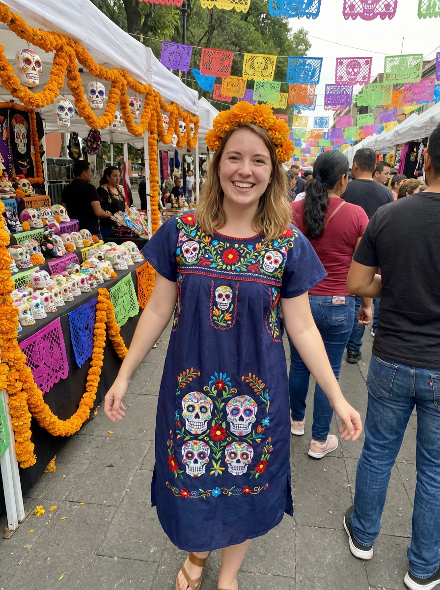 a model in a colorful traditional dress with skull motifs , capturing their joyful energy during the celebrations, with sugar skulls and marigold decorations