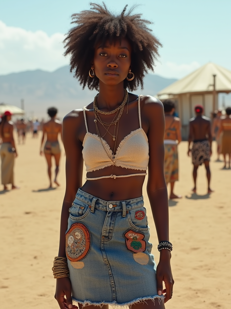 a model in a crop top and denim skirt with festival patches , embodying the DIY fashion culture of Coachella in the Indio desert