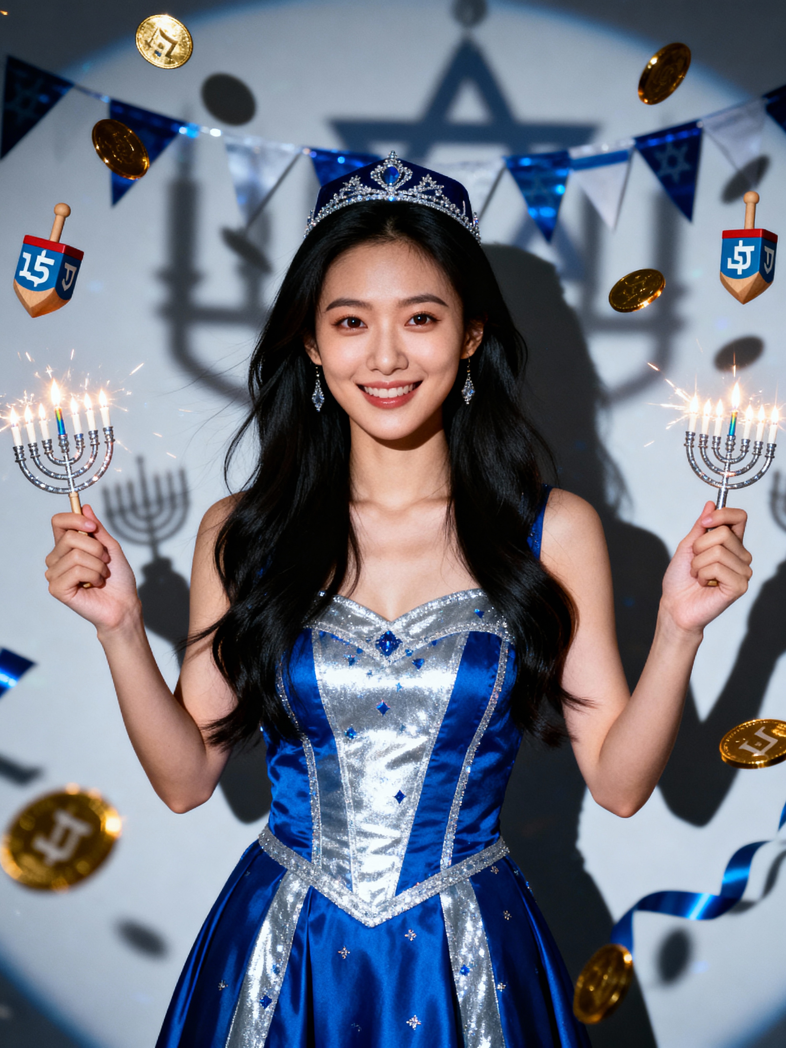 a model in a festive blue and silver outfit , capturing their joyful energy during Hanukkah celebrations, with dreidels and gelt decorations