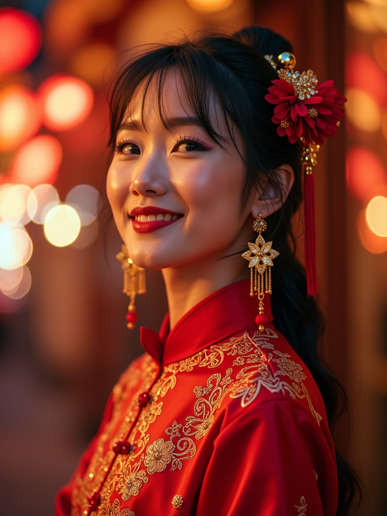 a model in a festive red outfit with gold accessories , capturing their joyful energy during the Lunar Chinese New Year celebrations, with firecrackers and lion dance decorations