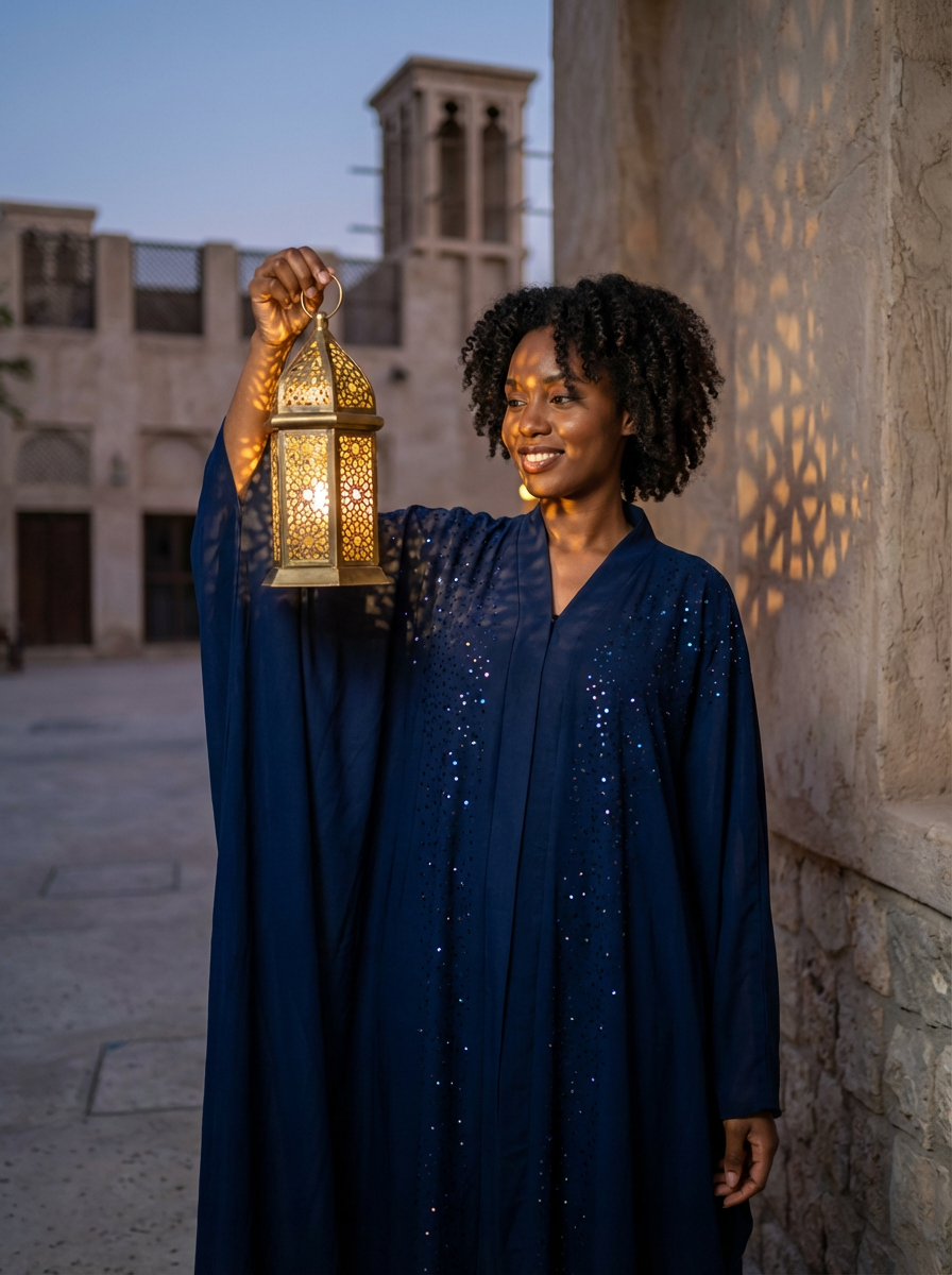 a model in a flowing abaya with subtle sparkles , striking a pose with a beautiful Ramadan lantern casting intricate light patterns