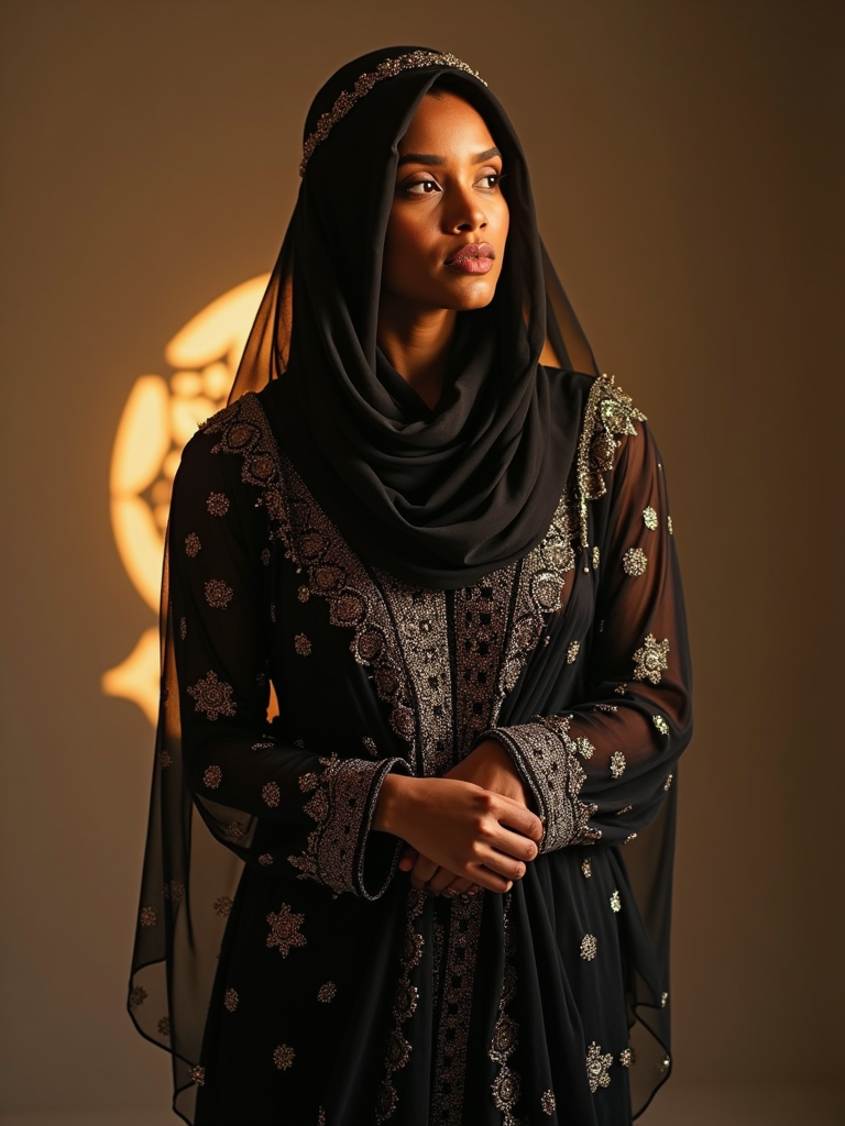 a model in a flowing abaya with subtle sparkles , striking a pose with beautiful Eid decorations casting intricate light patterns