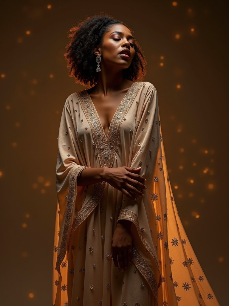 a model in a flowing abaya with subtle sparkles , striking a pose with beautiful Eid decorations casting intricate light patterns