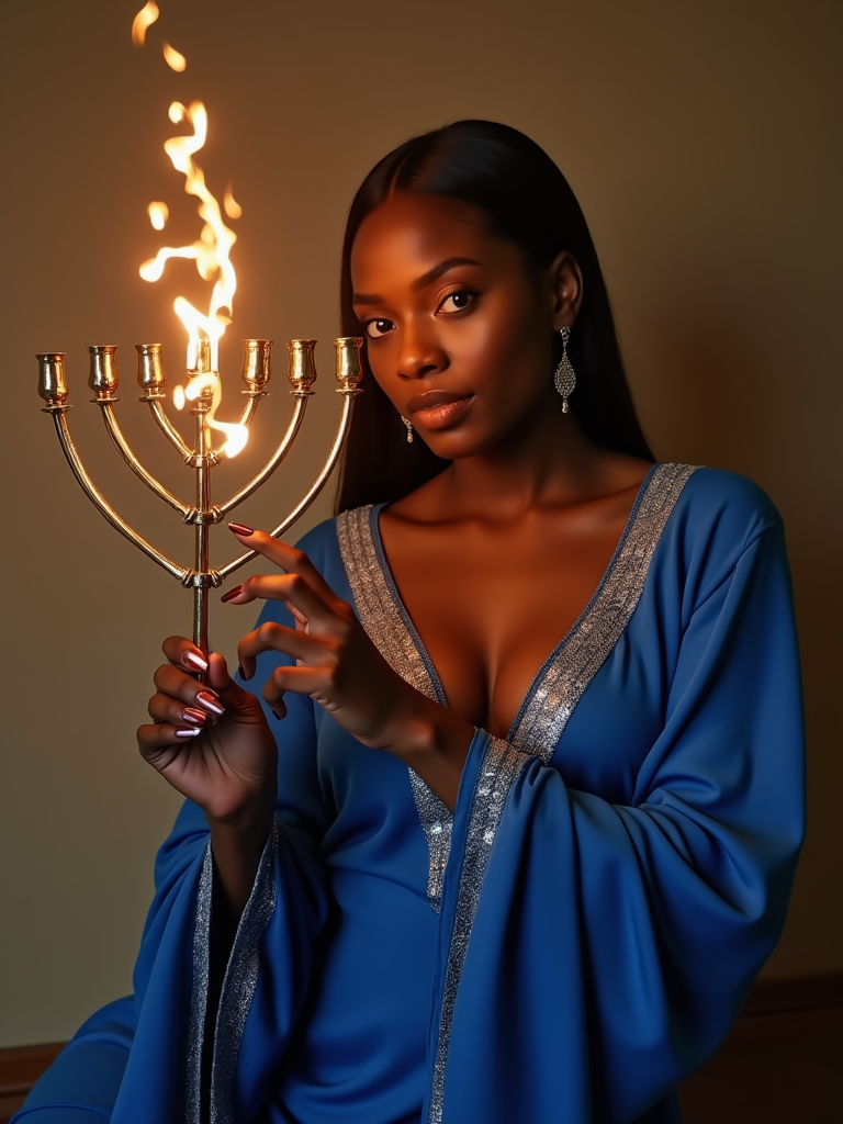 a model in a flowing blue outfit with silver accents , striking a pose with a beautiful menorah casting warm golden light patterns