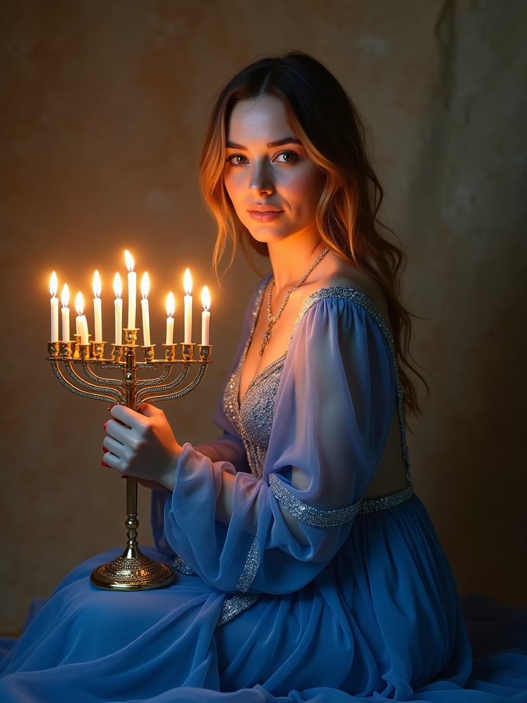 a model in a flowing blue outfit with silver accents , striking a pose with a beautiful menorah casting warm golden light patterns