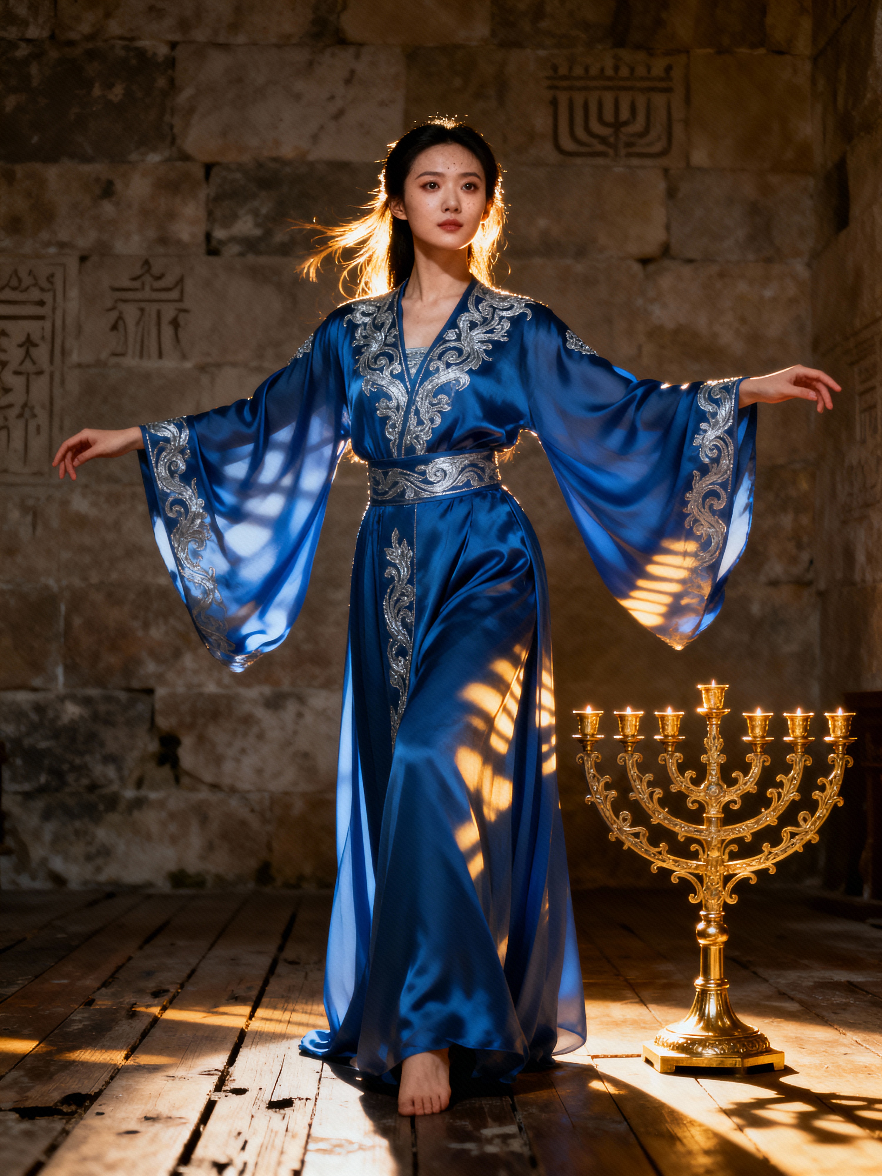 a model in a flowing blue outfit with silver accents , striking a pose with a beautiful menorah casting warm golden light patterns