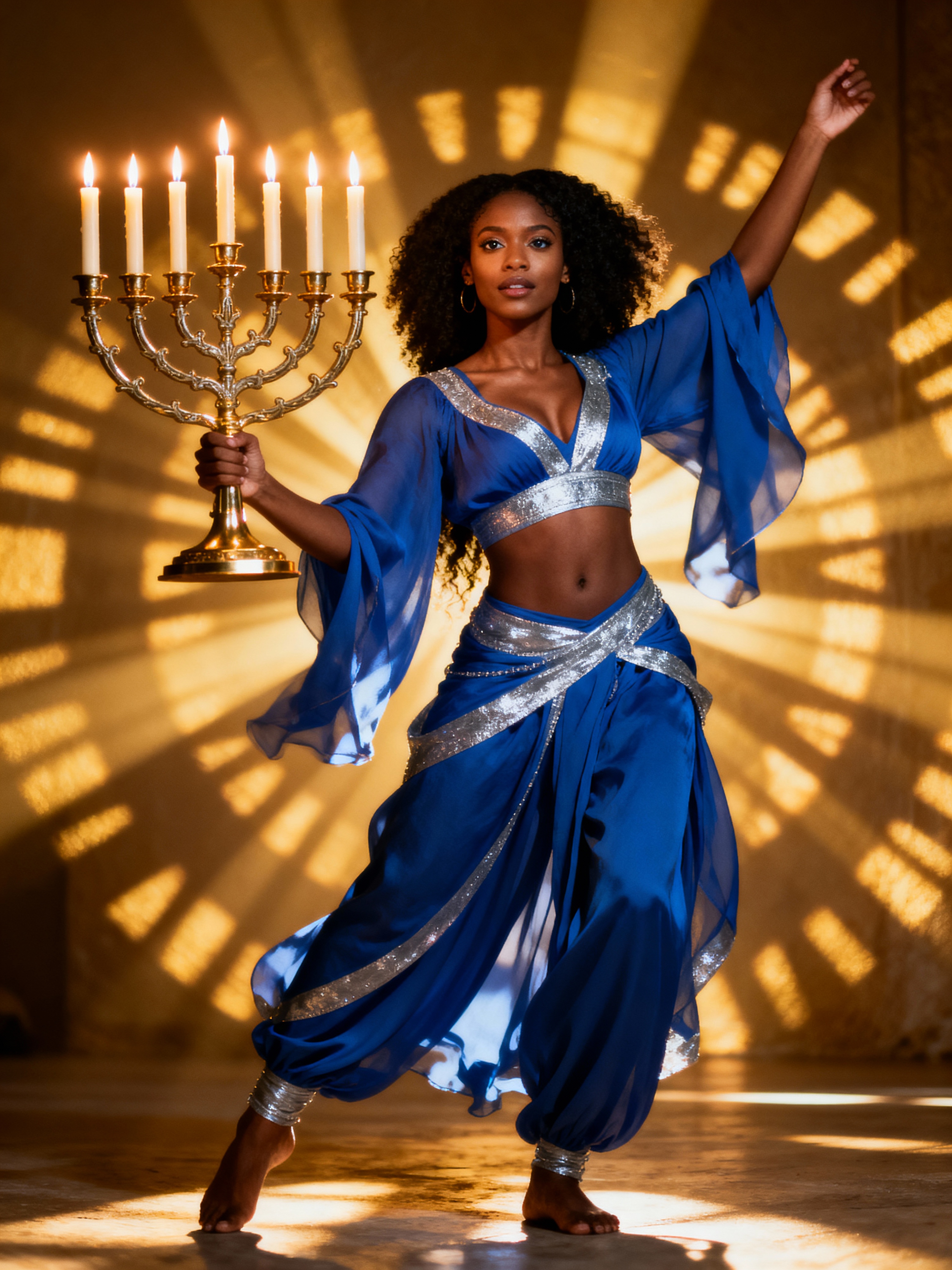 a model in a flowing blue outfit with silver accents , striking a pose with a beautiful menorah casting warm golden light patterns