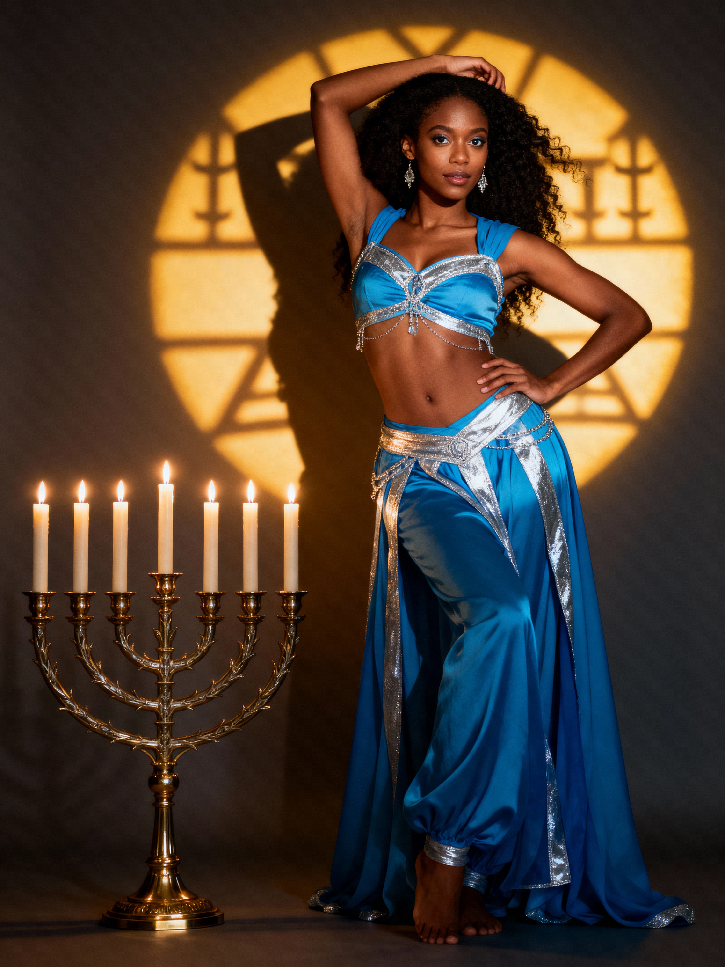 a model in a flowing blue outfit with silver accents , striking a pose with a beautiful menorah casting warm golden light patterns