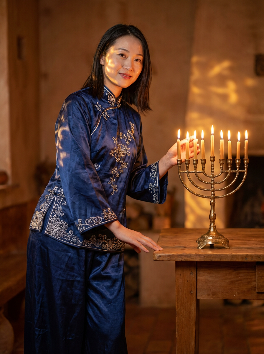 a model in a flowing blue outfit with silver accents , striking a pose with a beautiful menorah casting warm golden light patterns