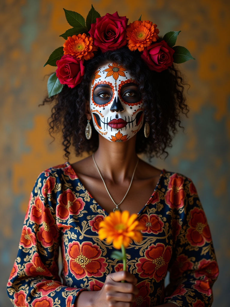 a model in a flowing traditional dress with floral patterns , embodying the joyful and spiritual nature of Day of the Dead, with a sugar skull or marigold in hand