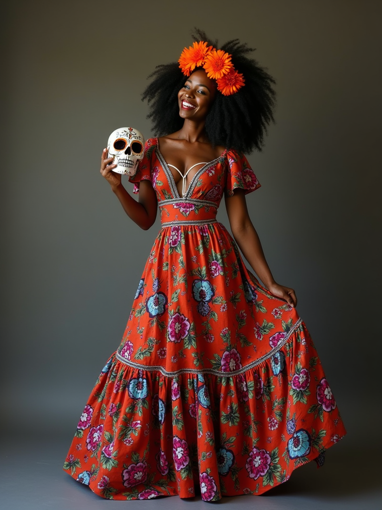 a model in a flowing traditional dress with floral patterns , embodying the joyful and spiritual nature of Day of the Dead, with a sugar skull or marigold in hand