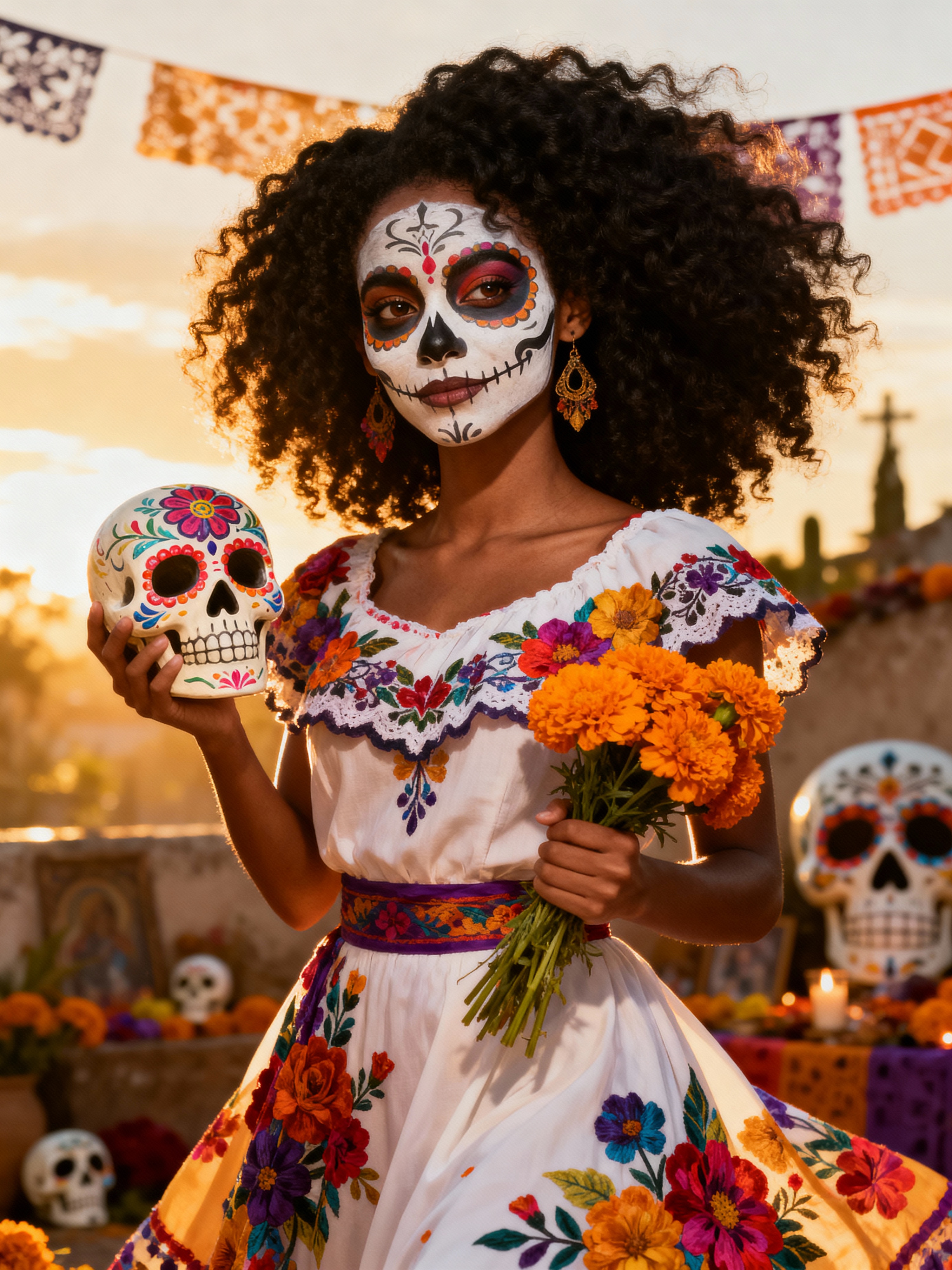 a model in a flowing traditional dress with floral patterns , embodying the joyful and spiritual nature of Day of the Dead, with a sugar skull or marigold in hand