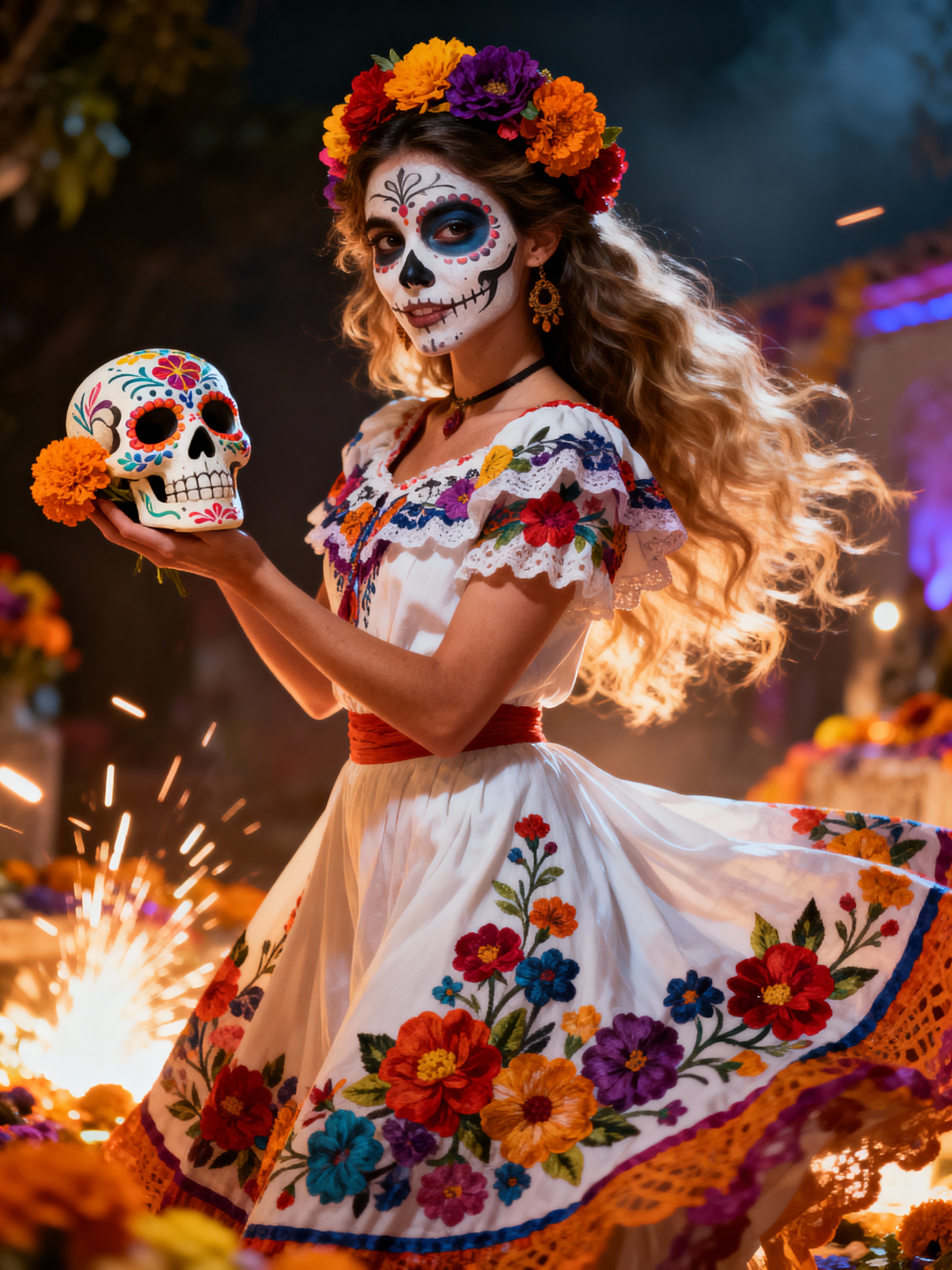 a model in a flowing traditional dress with floral patterns , embodying the joyful and spiritual nature of Day of the Dead, with a sugar skull or marigold in hand