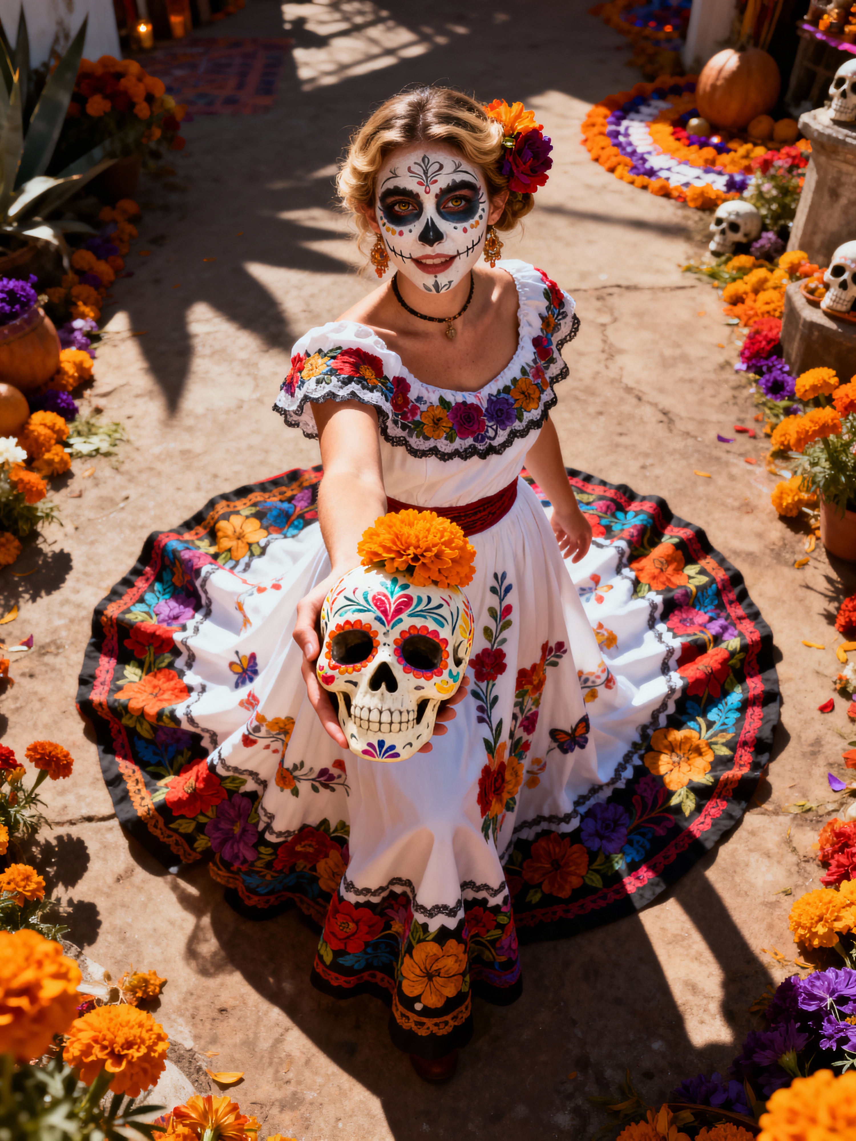 a model in a flowing traditional dress with floral patterns , embodying the joyful and spiritual nature of Day of the Dead, with a sugar skull or marigold in hand