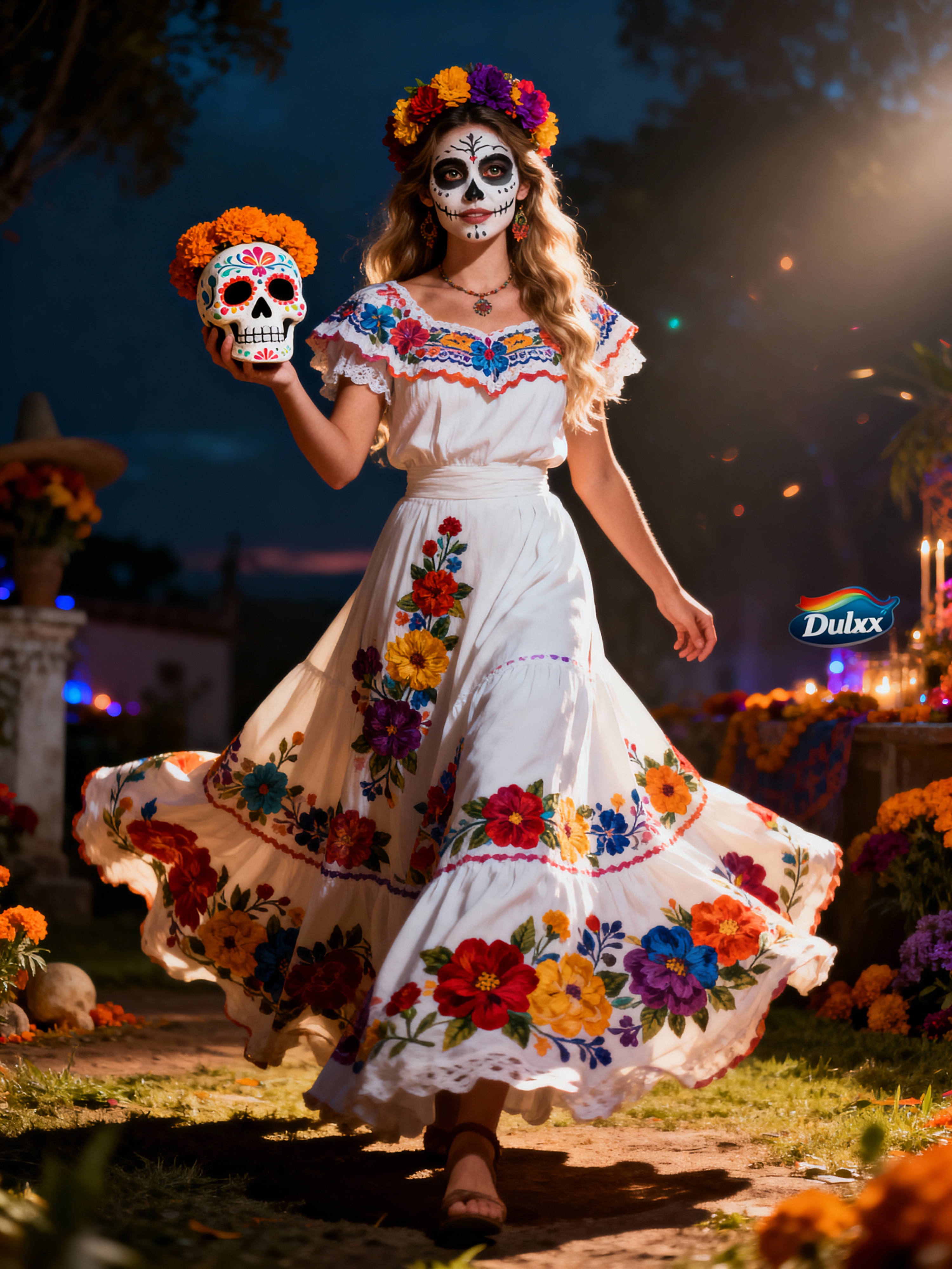 a model in a flowing traditional dress with floral patterns , embodying the joyful and spiritual nature of Day of the Dead, with a sugar skull or marigold in hand