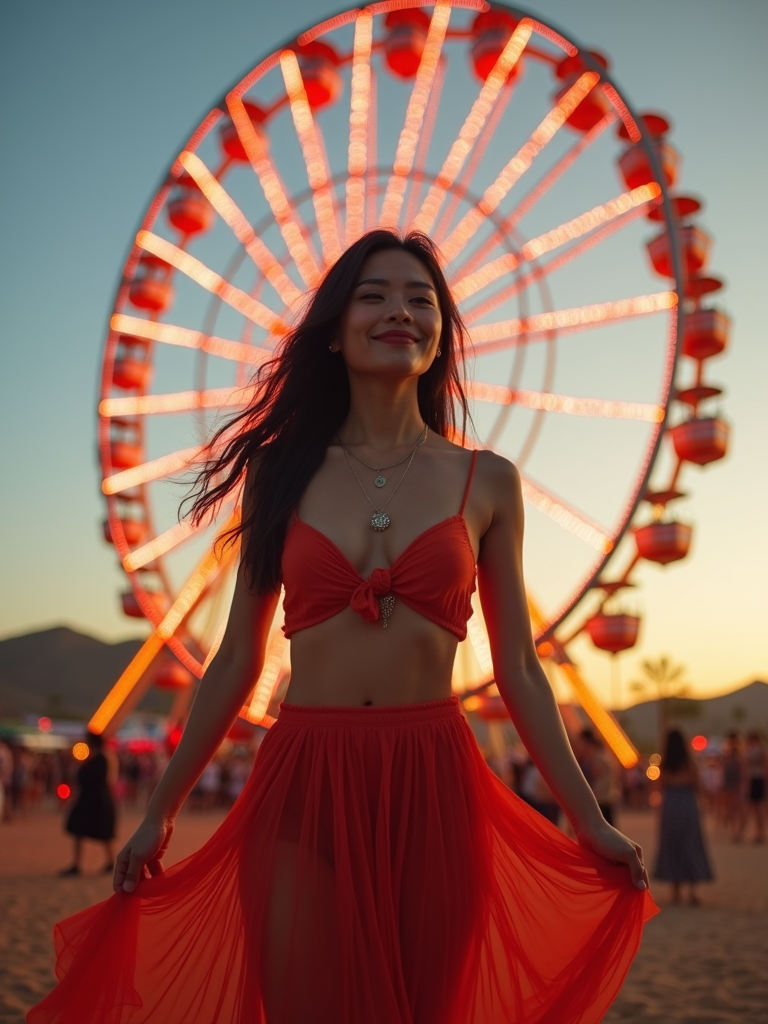 a model in a flowy bohemian skirt and crop top , capturing their infectious energy and enthusiasm at Coachella, with the iconic ferris wheel glowing at dusk