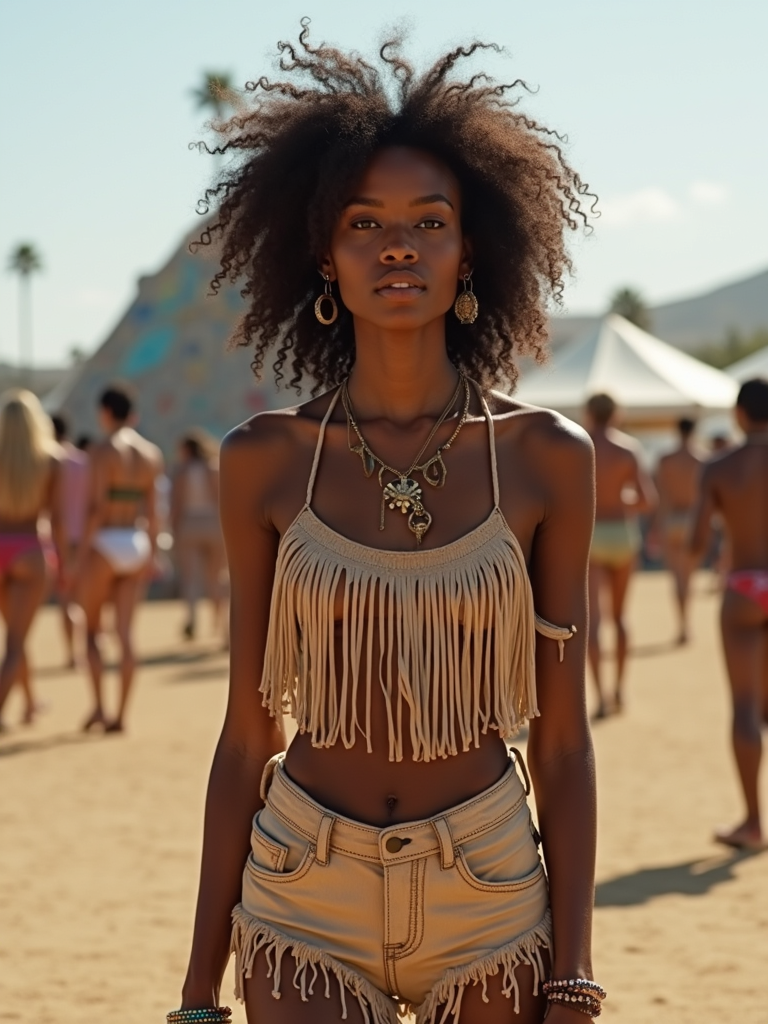 a model in a fringed crop top and high-waisted shorts , embodying the free-spirited and carefree nature of Coachella, with art installations visible in the background