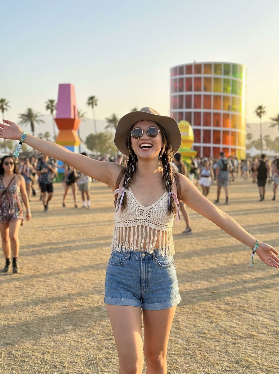 a model in a fringed crop top and high-waisted shorts , embodying the free-spirited and carefree nature of Coachella, with art installations visible in the background