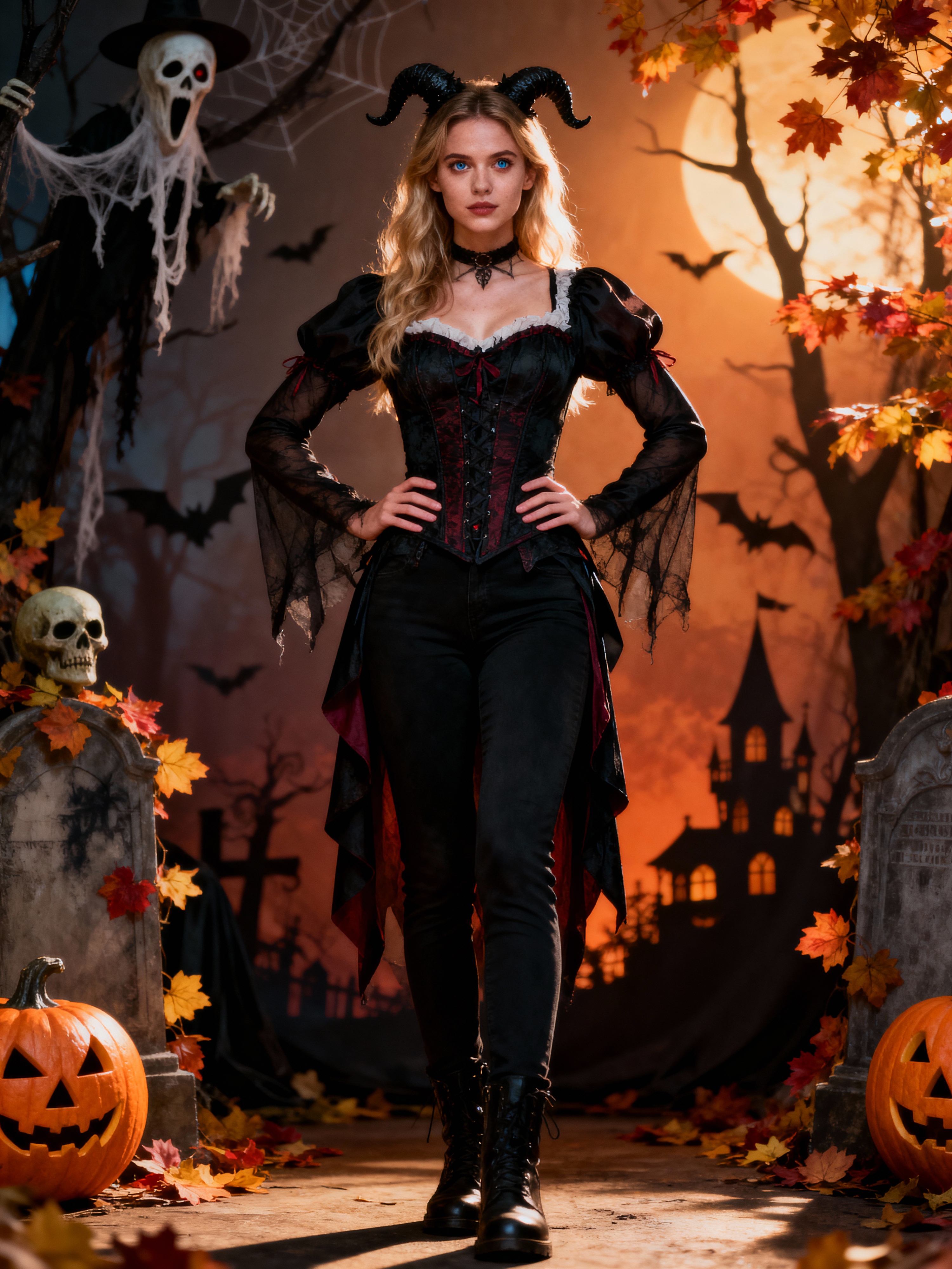 A model in a halloween costume, standing confidently in front of a Halloween-themed backdrop with spooky decorations and autumn leaves.