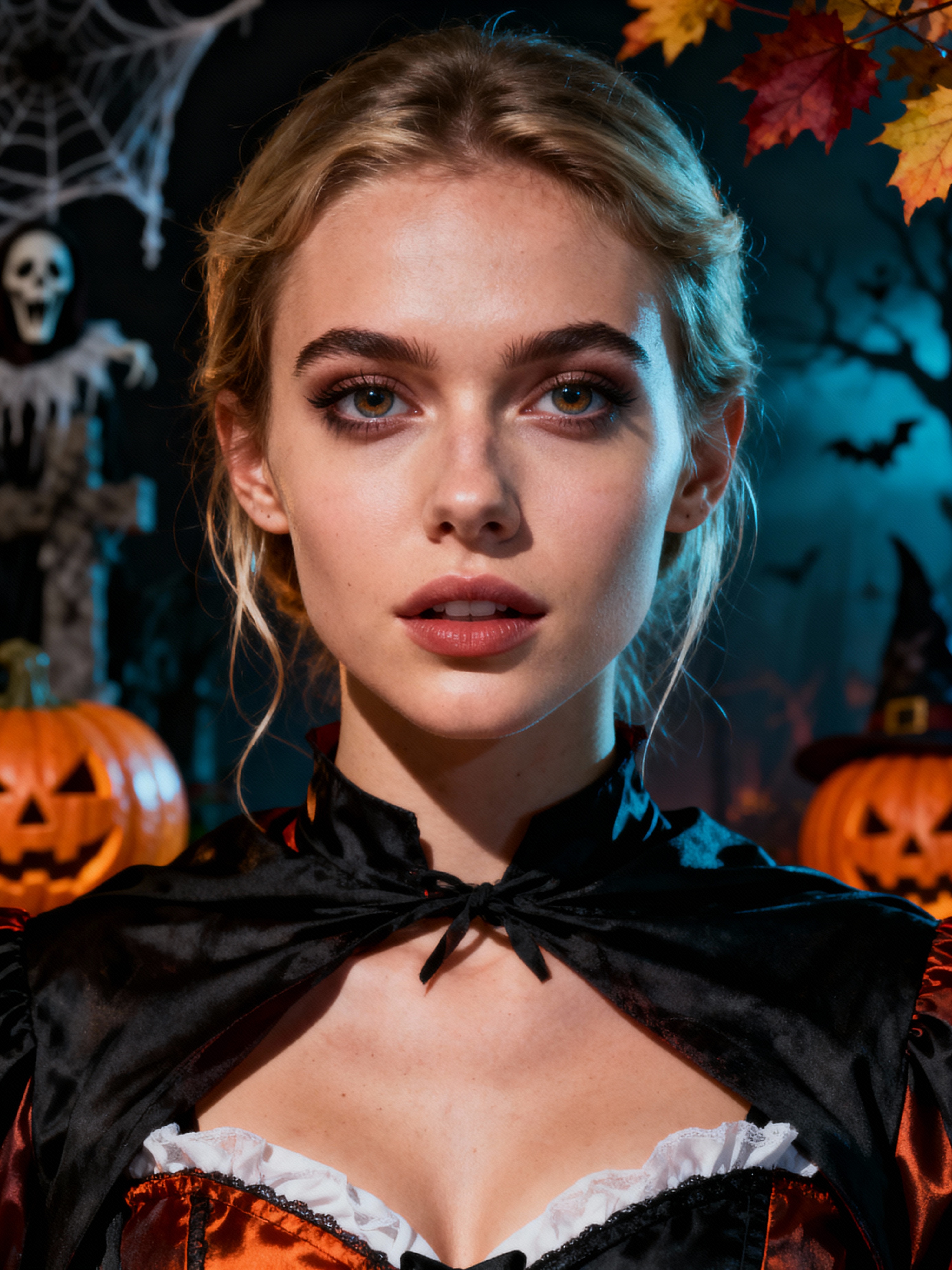 A model in a halloween costume, standing confidently in front of a Halloween-themed backdrop with spooky decorations and autumn leaves.
