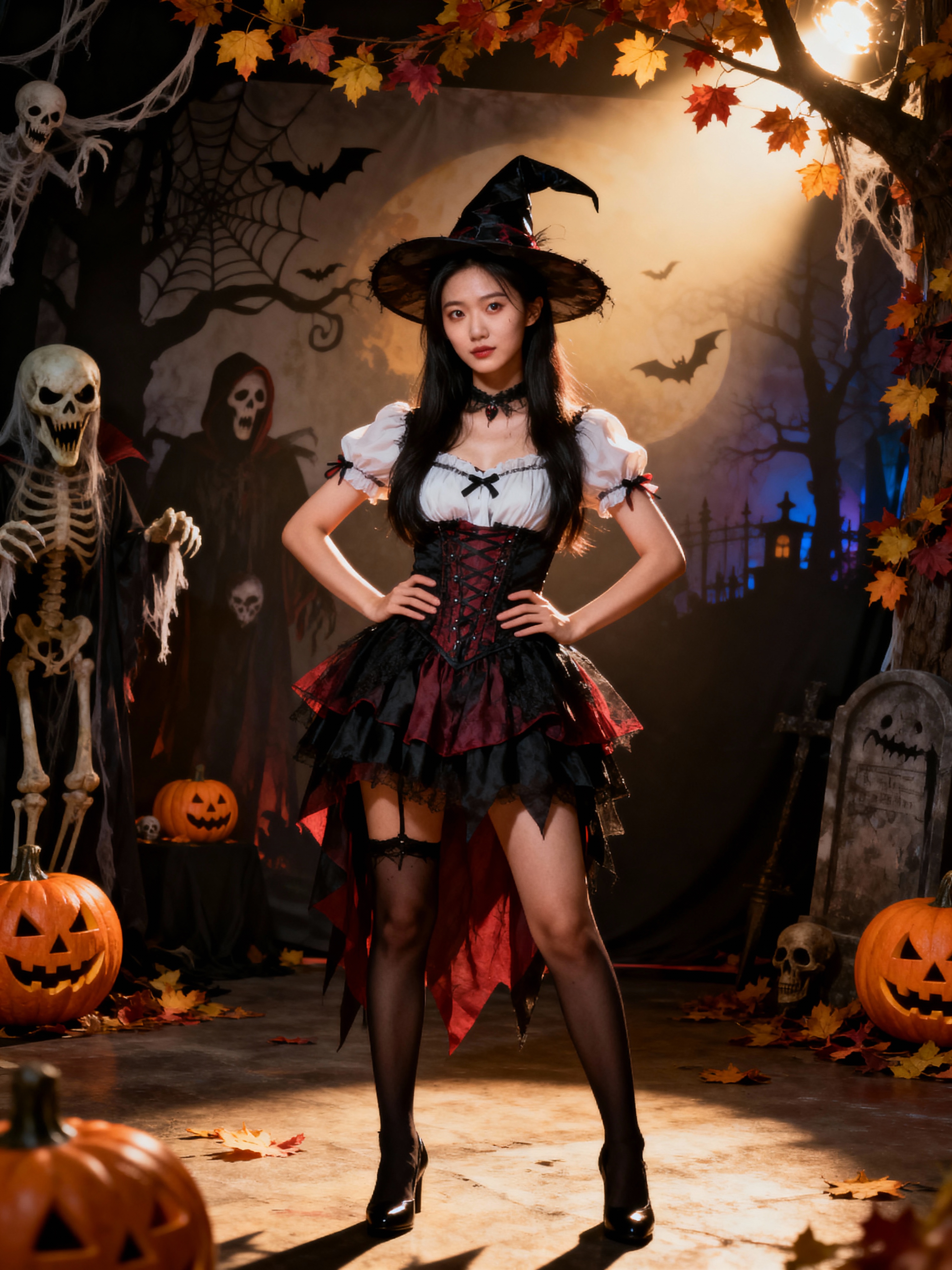 A model in a halloween costume, standing confidently in front of a Halloween-themed backdrop with spooky decorations and autumn leaves.