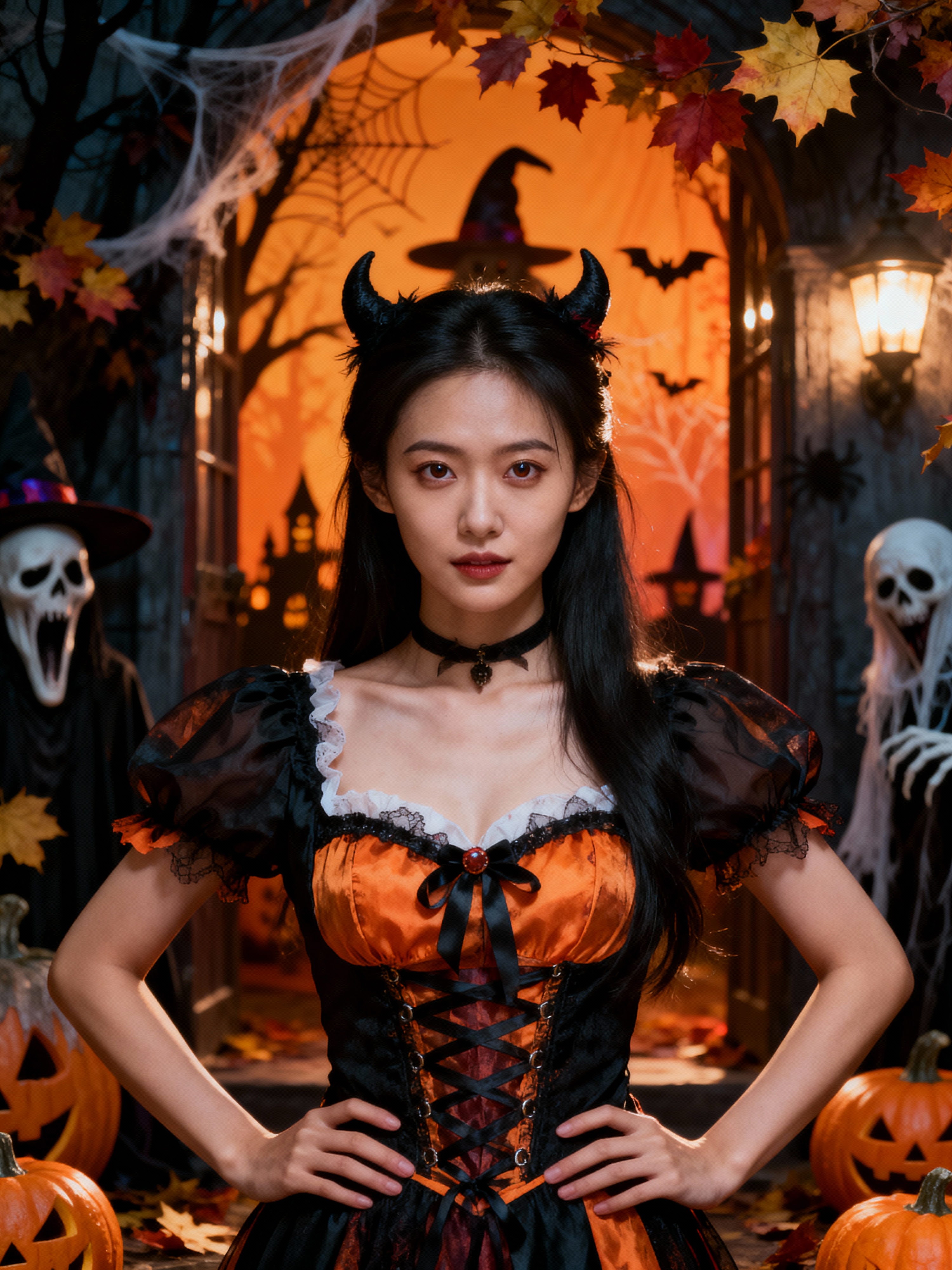 A model in a halloween costume, standing confidently in front of a Halloween-themed backdrop with spooky decorations and autumn leaves.