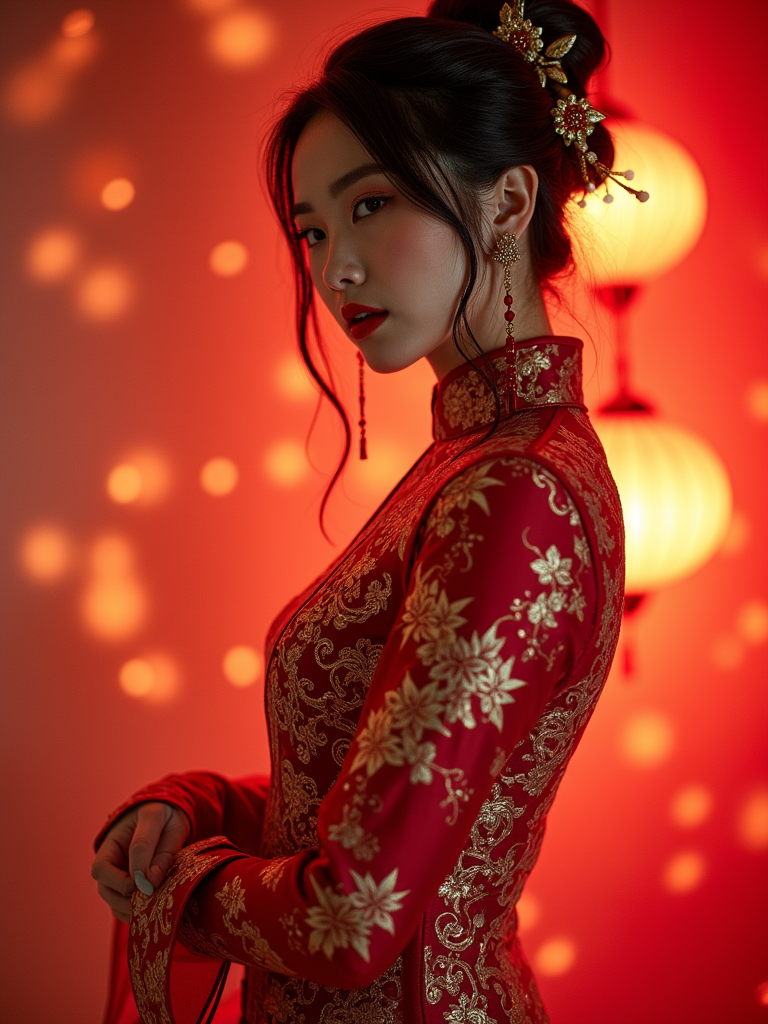 a model in a modern qipao with traditional motifs , striking a pose with beautiful red and gold decorations casting festive light patterns