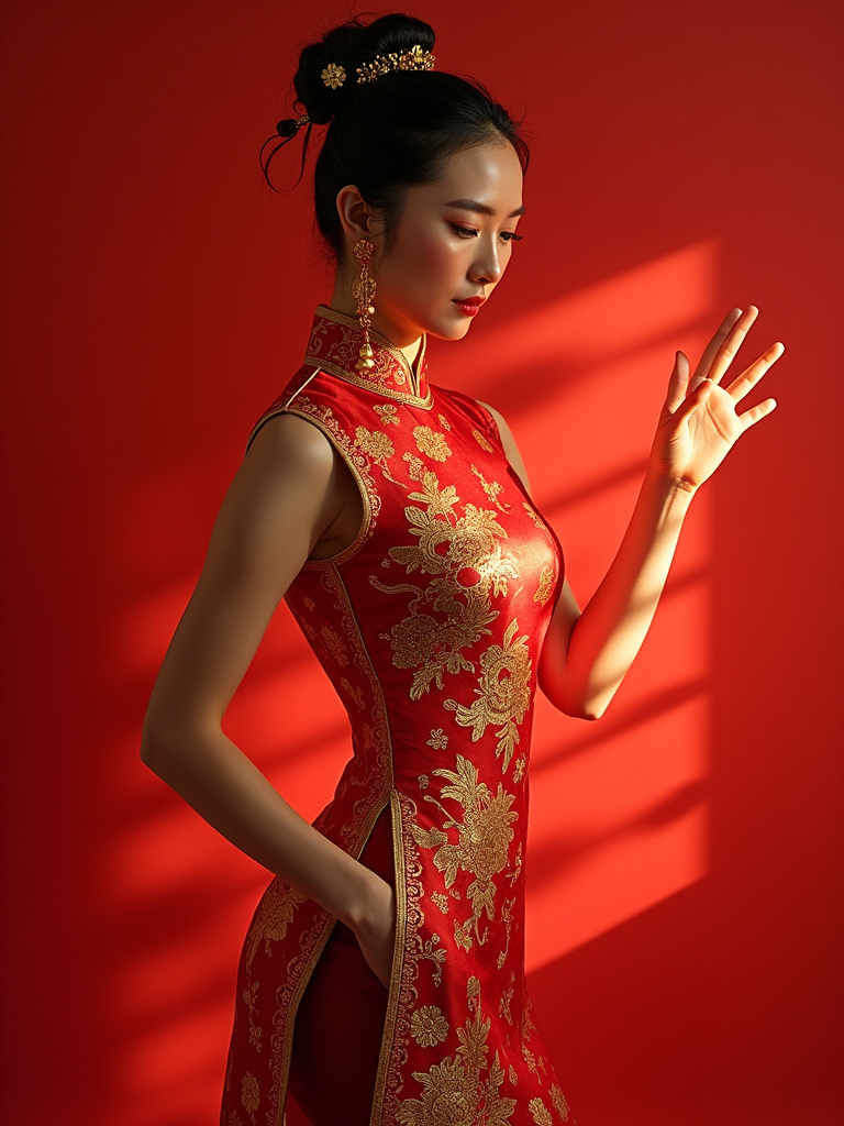 a model in a modern qipao with traditional motifs , striking a pose with beautiful red and gold decorations casting festive light patterns