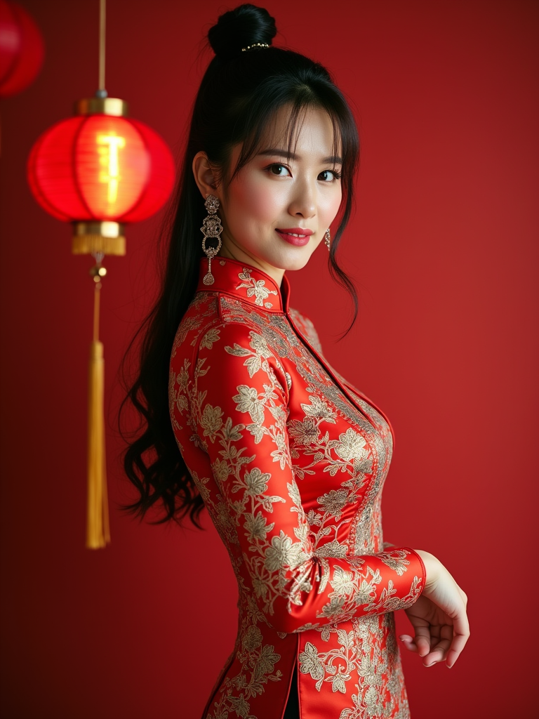 a model in a modern qipao with traditional motifs , striking a pose with beautiful red and gold decorations casting festive light patterns