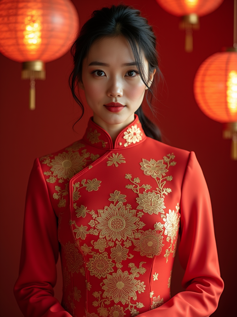 a model in a modern qipao with traditional motifs , striking a pose with beautiful red and gold decorations casting festive light patterns