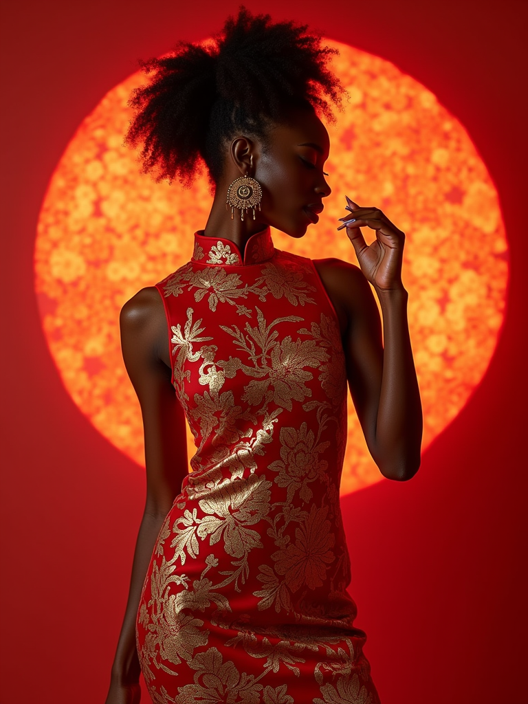 a model in a modern qipao with traditional motifs , striking a pose with beautiful red and gold decorations casting festive light patterns