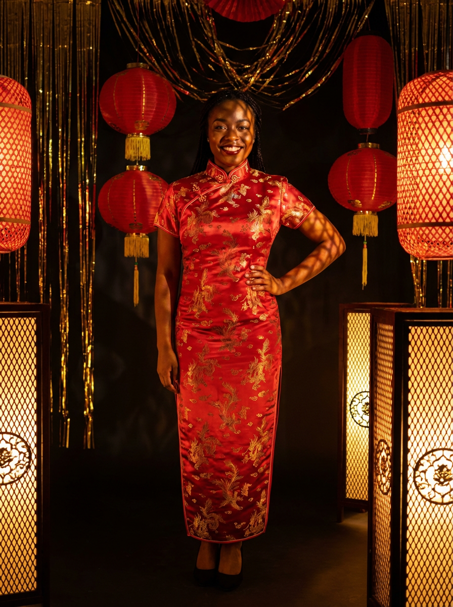 a model in a modern qipao with traditional motifs , striking a pose with beautiful red and gold decorations casting festive light patterns