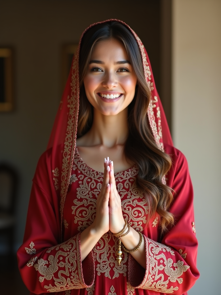 a model in a modest festive outfit with embroidered details , embodying the joyful and blessed nature of Eid, with prayer beads in hand