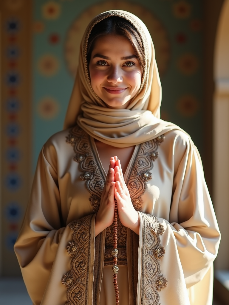 a model in a modest festive outfit with embroidered details , embodying the joyful and blessed nature of Eid, with prayer beads in hand
