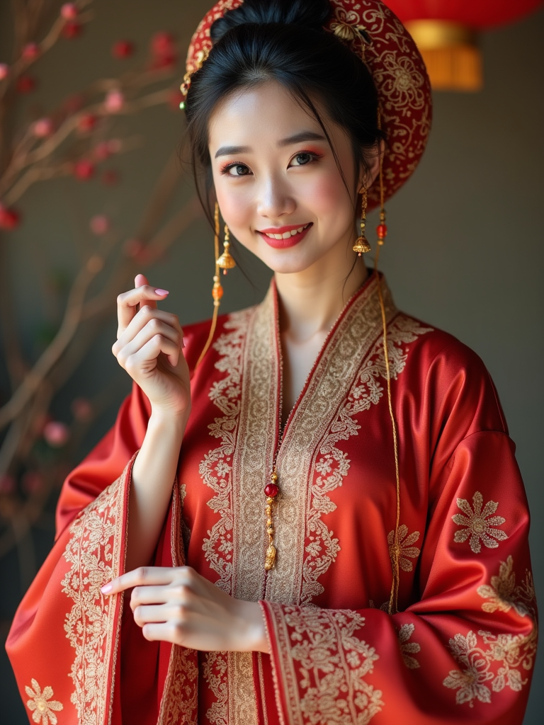 a model in a modest festive outfit with embroidered details , embodying the joyful and blessed nature of Eid, with prayer beads in hand