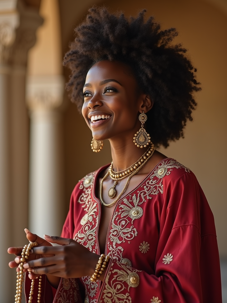 a model in a modest festive outfit with embroidered details , embodying the joyful and blessed nature of Eid, with prayer beads in hand