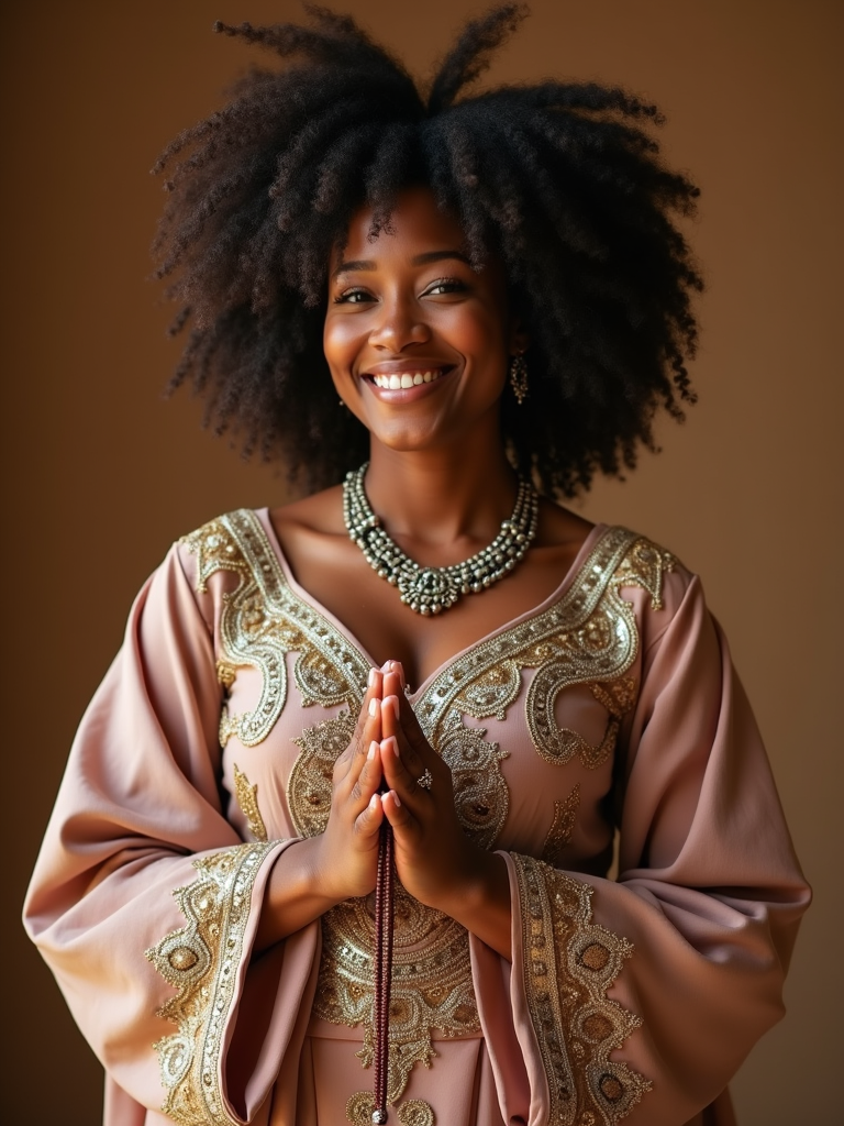 a model in a modest festive outfit with embroidered details , embodying the joyful and blessed nature of Eid, with prayer beads in hand