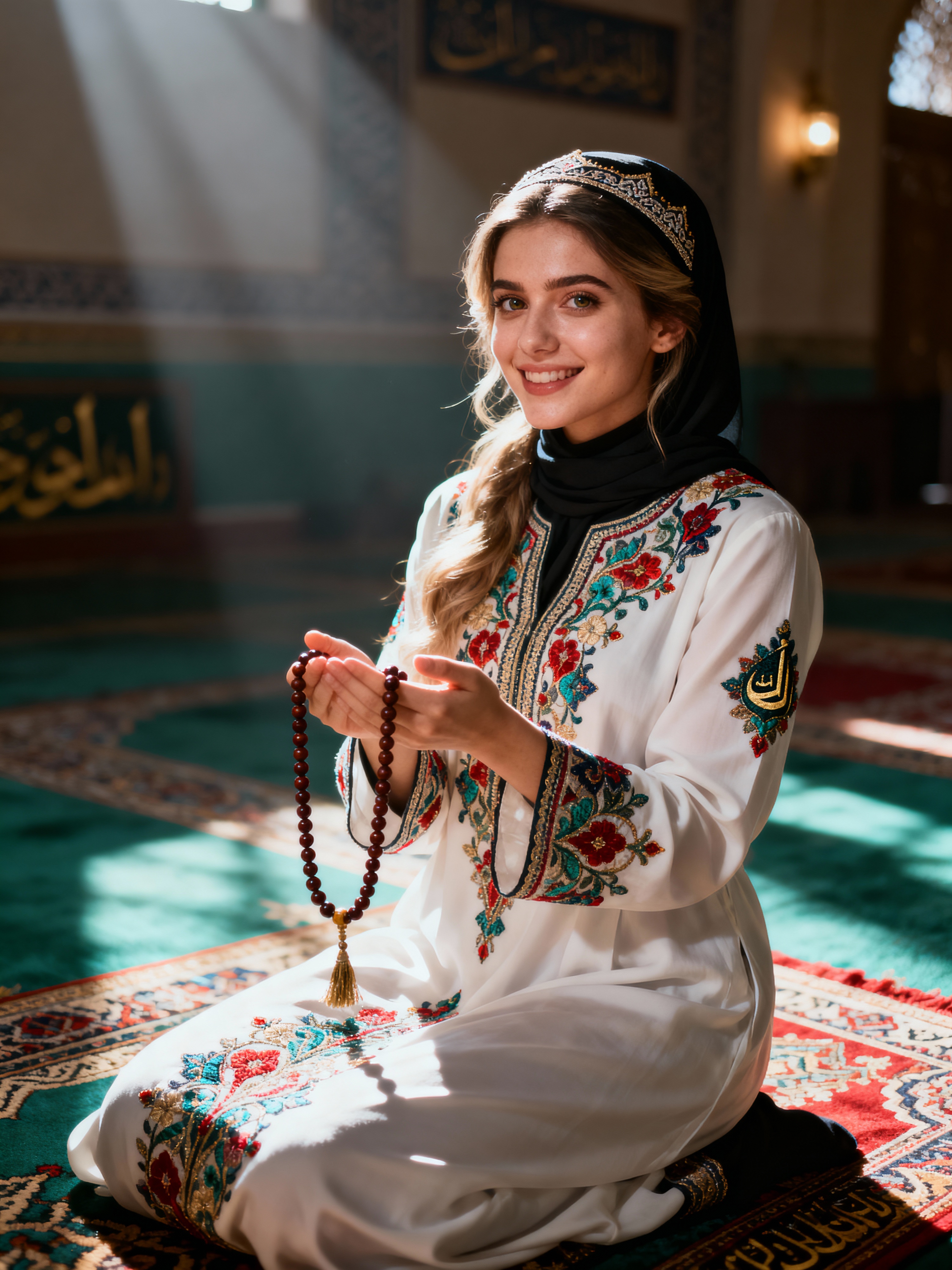a model in a modest festive outfit with embroidered details , embodying the joyful and blessed nature of Eid, with prayer beads in hand