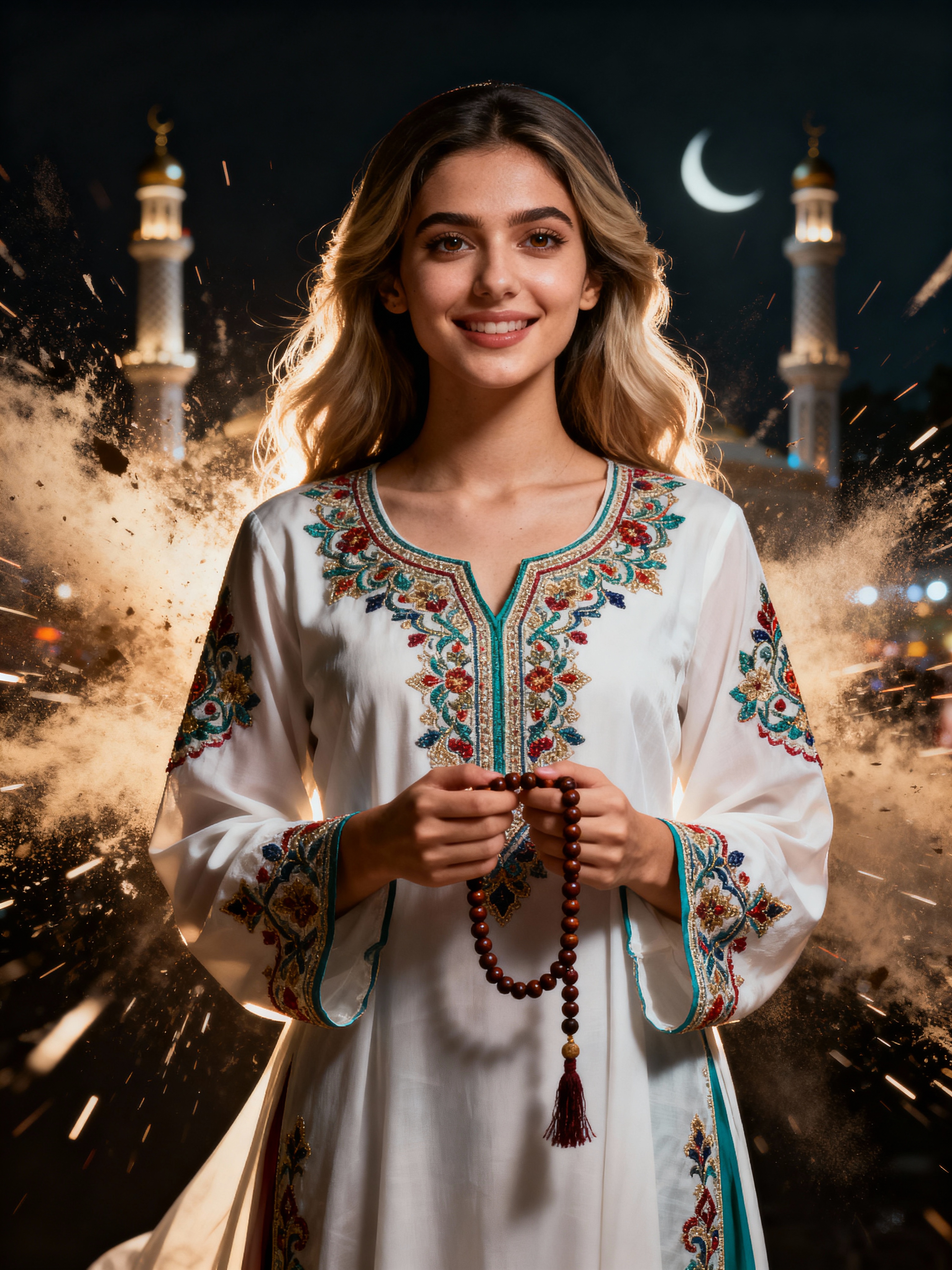 a model in a modest festive outfit with embroidered details , embodying the joyful and blessed nature of Eid, with prayer beads in hand