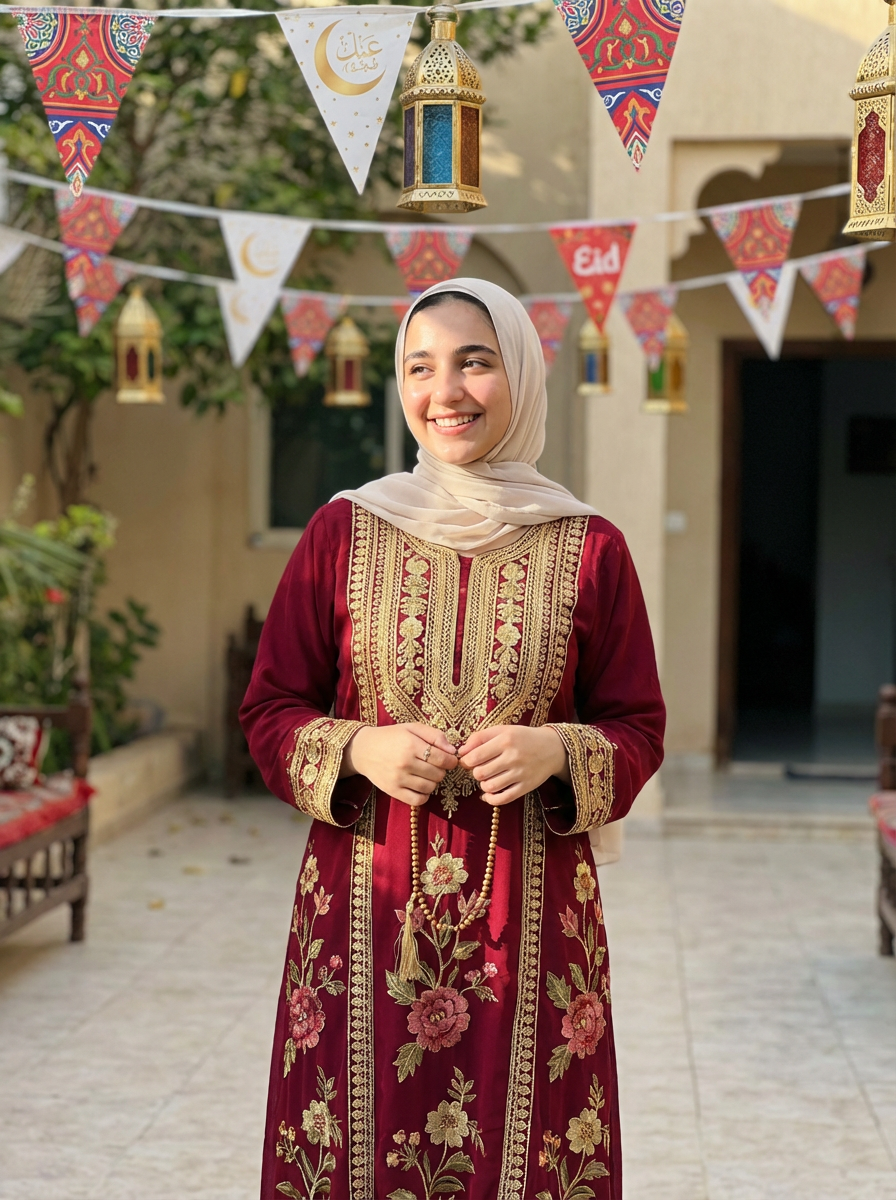 a model in a modest festive outfit with embroidered details , embodying the joyful and blessed nature of Eid, with prayer beads in hand