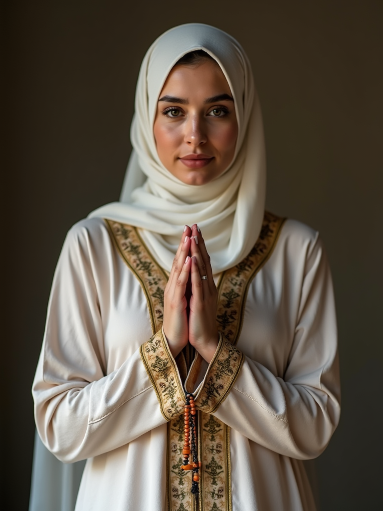 a model in a modest festive outfit with embroidered details , embodying the peaceful and reflective nature of Ramadan, with prayer beads in hand