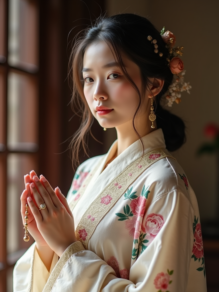 a model in a modest festive outfit with embroidered details , embodying the peaceful and reflective nature of Ramadan, with prayer beads in hand