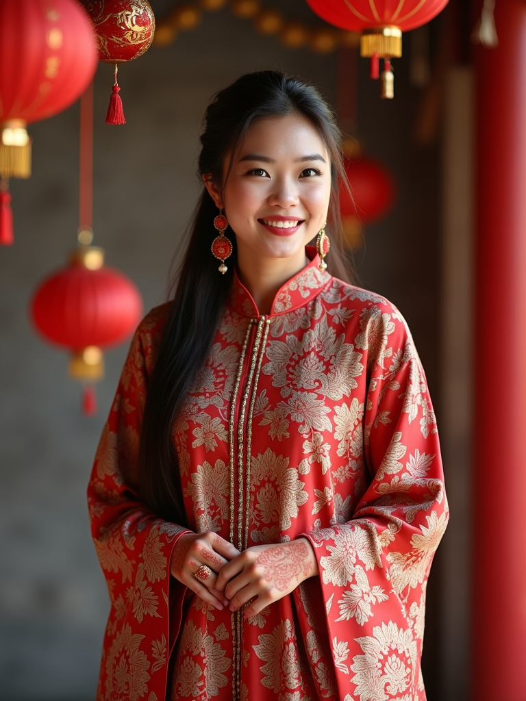 a model in a modest yet fashionable Eid outfit , capturing their joyful energy during the end of Ramadan celebrations, with henna designs and festive decorations