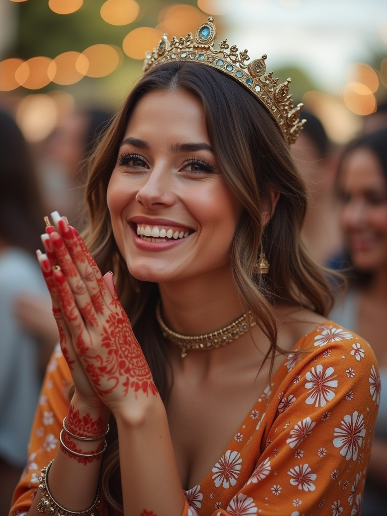 a model in a modest yet fashionable Eid outfit , capturing their joyful energy during the celebrations, with henna designs and festive decorations
