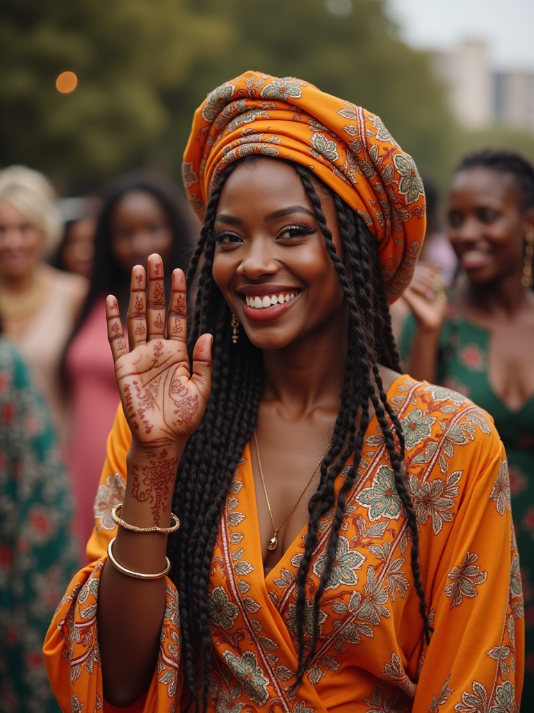 a model in a modest yet fashionable Eid outfit , capturing their joyful energy during the celebrations, with henna designs and festive decorations